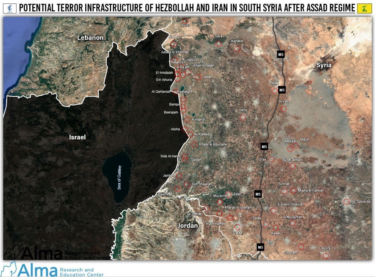 The map below — from the Alma Research and Education Center — shows just how dense the Iranian and Hezbollah footprint in southern Syria remains: